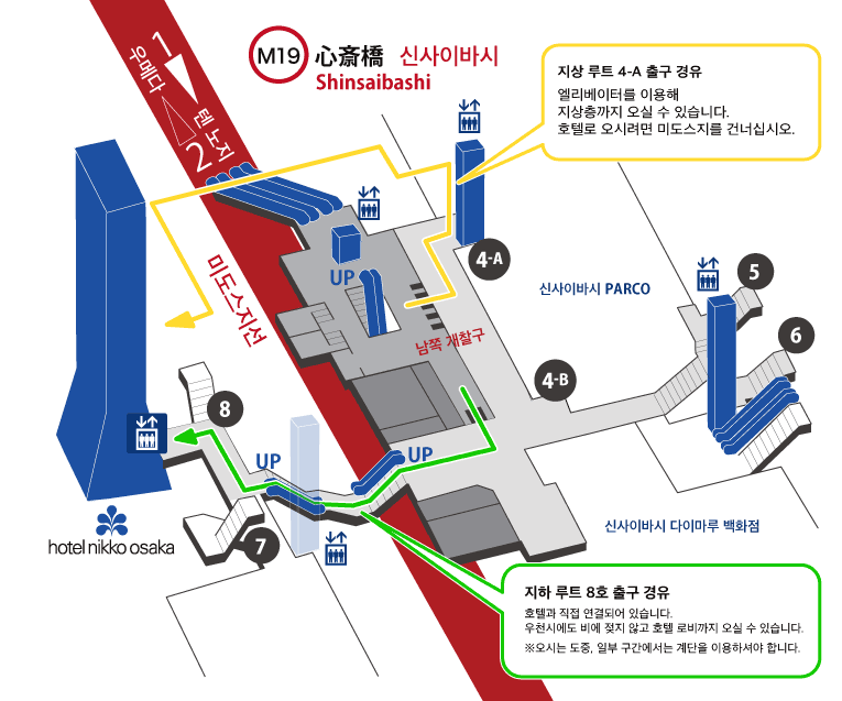 오사카의 상징적인 거리인 미도스지에 면한 호텔 닛코 오사카는 오사카 메트로 미도스지선 및 나가호리 쓰루미료쿠치선 “신사이바시역” 8번 출구와 바로 연결되어 있습니다. 역의 개찰구에서 지하 연결 통로를 통해 비 오는 날에도 젖지 않고 오실 수 있습니다.