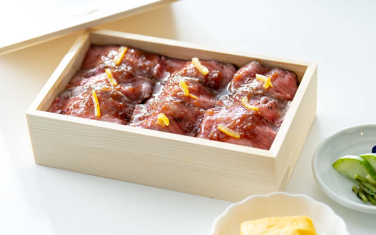 A4ランク黒毛和牛サーロインのローストビーフをお重仕立てにしています。ソースは和風のシャリアピンソース。オリジナルの玉子焼きを添えて。