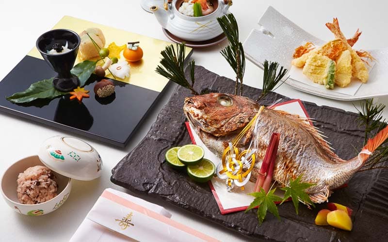 お祝いの 御祝肴、赤飯、鯛の姿焼きなどを取り入れた特別会席でお席を華やかに彩ります。