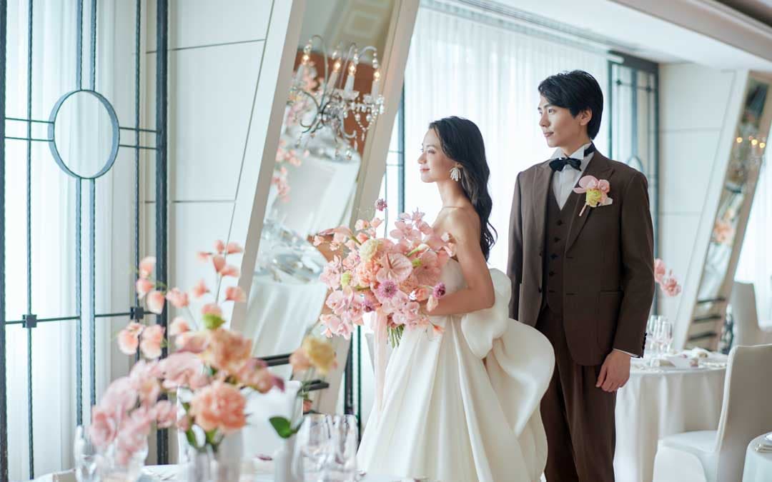 大きな窓越しに明るい自然光が注ぐパーティー会場。シャンデリアやミラーのきらめきが優美な気品を漂わせて、花嫁の可憐なドレス姿がいっそう美しく輝きます。