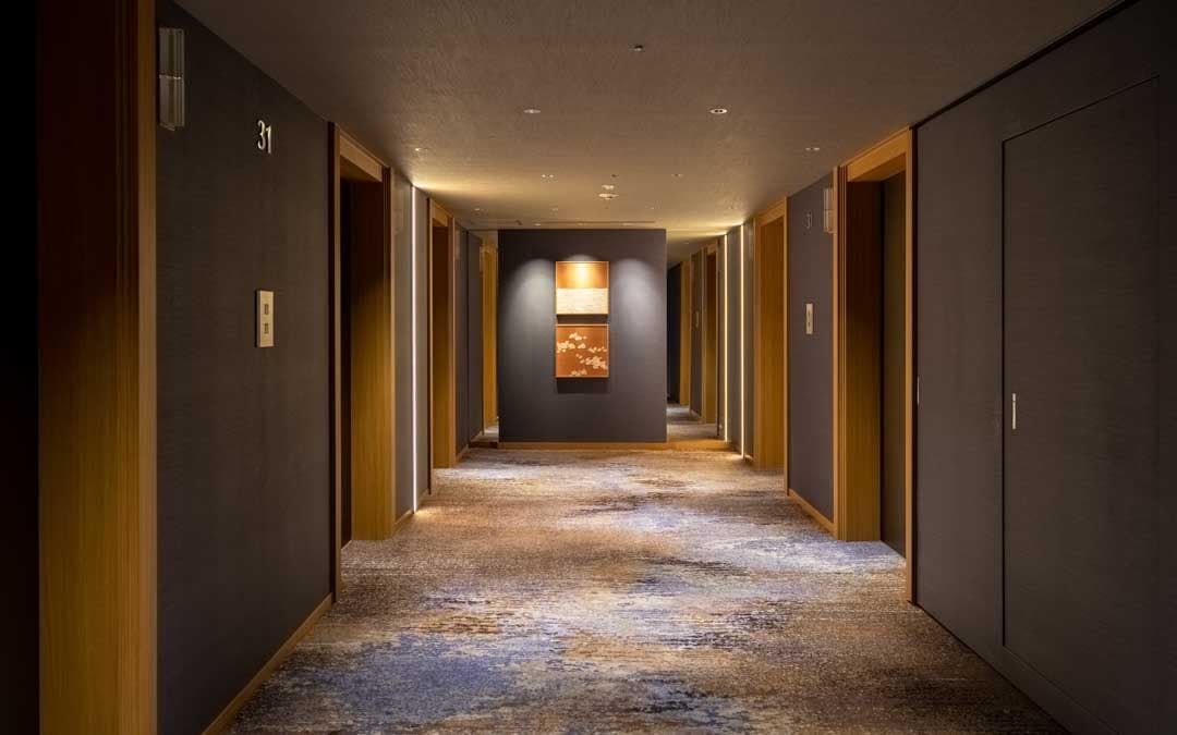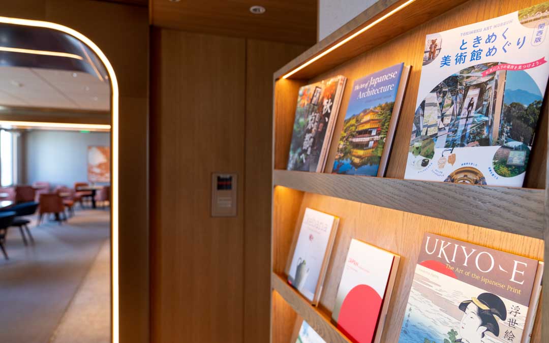 Designed around the concepts of composure, elegance, lightness, and harmony, the Nikko Lounge welcomes you. From the elevator hall, cloud-inspired carpeting and linear wall lighting guide you into the lounge. Original artworks in the elevator hall and lounge depict seasonal cloudscapes, setting a serene tone. Calming-toned interiors feature comfortable seating—sofas and bench seats—arranged to create distinct atmospheres in each area.