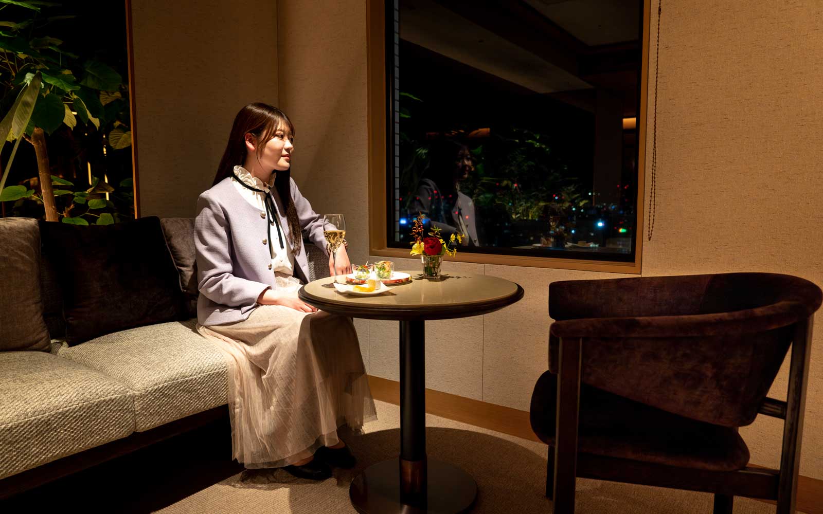 Enjoy a sophisticated evening while gazing at the changing view of Osaka City at dusk.