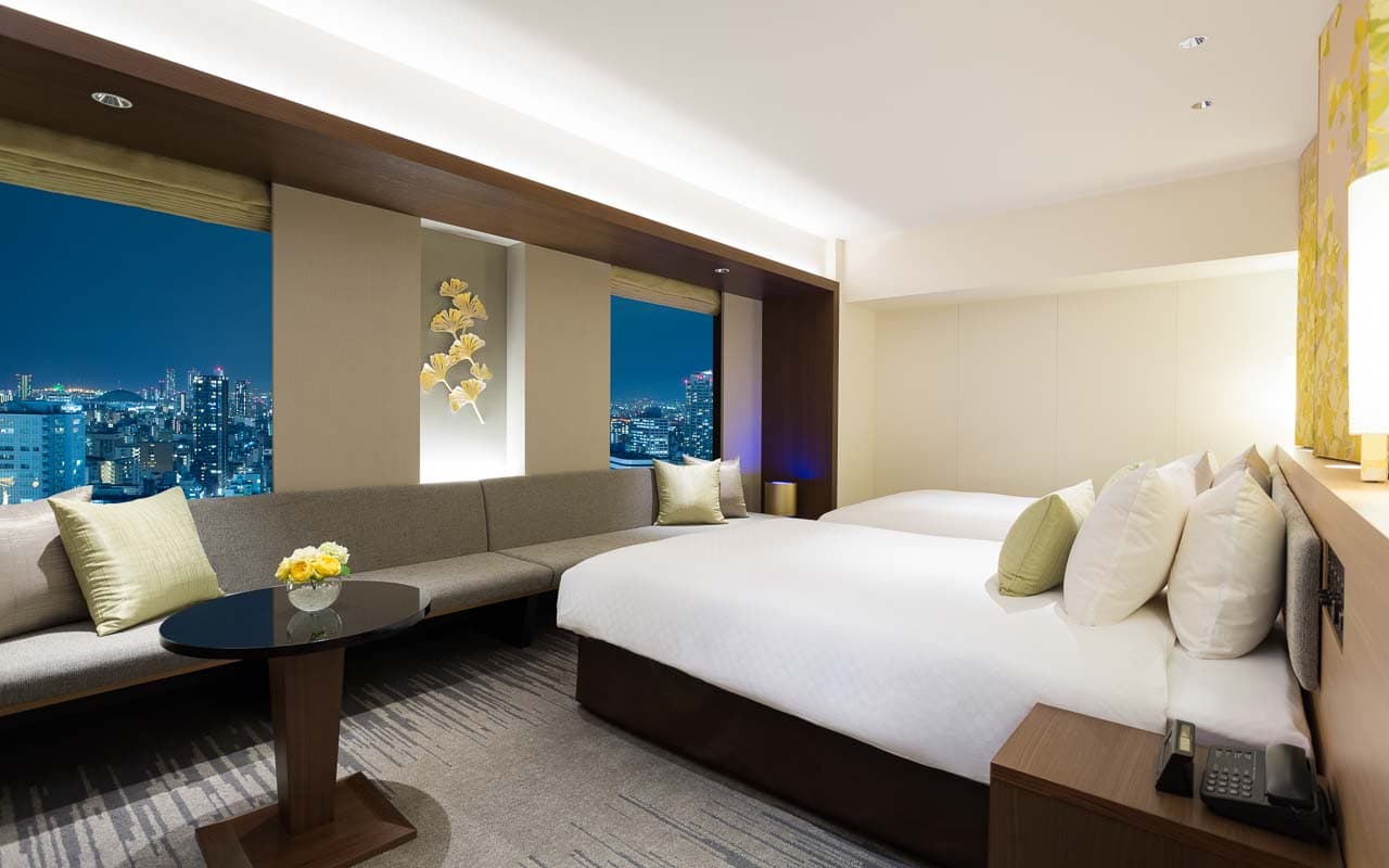 御堂筋のイチョウが舞う屏風の装飾や行灯をイメージした間接照明など、旅の疲れを優しく癒す美しい和のインテリア。