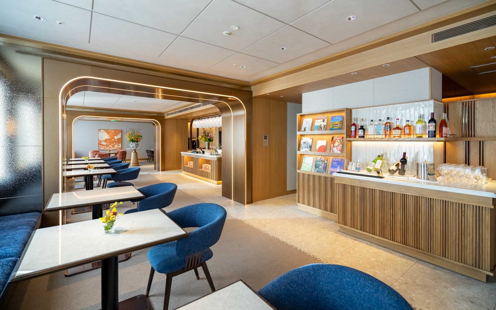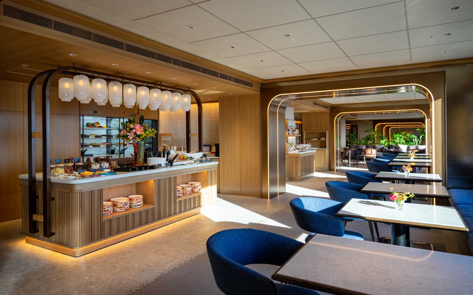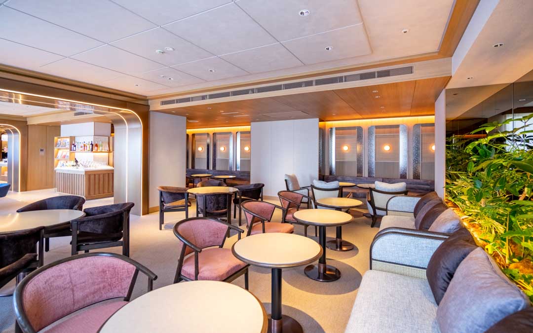 以『悠然・優美・浮游感・融合』為概念打造的日航貴賓室。 自電梯廳起,以雲為意象的地毯與牆面線性燈光引領您進入休憩之所。 電梯廳與休息室裡的原創藝術,描繪隨季節遞嬗的雲之景致,營造靜謐流動的時光。 沉穩色系的室內,配置沙發席、長椅等各具風情且舒適的座位。
