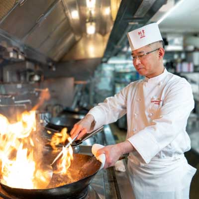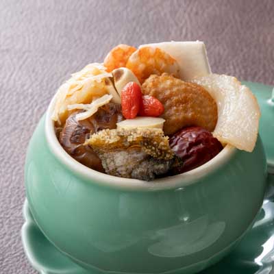 優れた技能を持つ職人だけが選ばれる「なにわの名工」。その栄誉を受けた芝料理長が、研ぎ澄まされた技で渾身の皿をお届けします。金箔をあしらったふかひれの姿煮込みに始まり、お好きなだけお楽しみいただける北京ダックのクレープ包み、活け国産イセ海老の炒めや希少な干し鮑の姿煮込みなど、贅を尽くした品々が続きます。 さらに、中国伝統の壺蒸しスープや、燕の巣入りデザートなど、選び抜かれた食材と熟練の技が織り成す、珠玉の味覚体験をぜひご堪能ください。