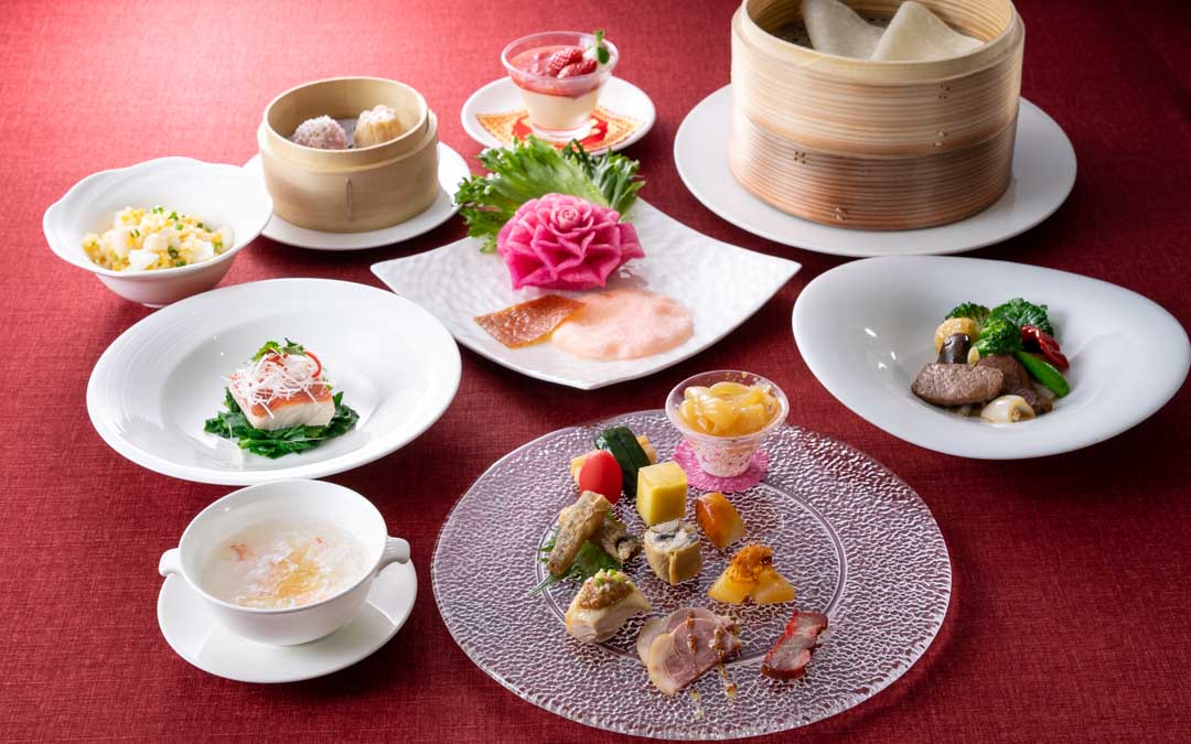 前菜盛り合わせ、蟹肉入りふかひれスープ、北京ダックのクレープ包み、蒸し点心二種、黒毛和牛の黒胡椒炒め、海老のチリソース煮、海鮮入り炒飯、デザート