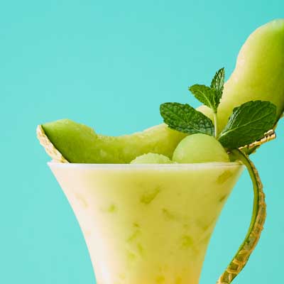 メロンリキュールをベースにした2トーンカクテル。上部はフレッシュメロンと生クリーム&ライムジュースでさっぱりと。下部は赤肉メロンのピューレ&オレンジジュースでスイートに。