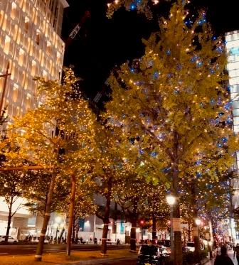 ホテル日航大阪の前の通りにもイチョウ並木に電飾が施され、とっても綺麗です。