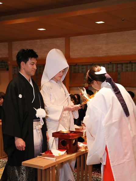 その後「三献の儀」3つの盃で新郎新婦が交互にお神酒(おみき)を酌み交わす、いわゆる「三三九度」を行います。
