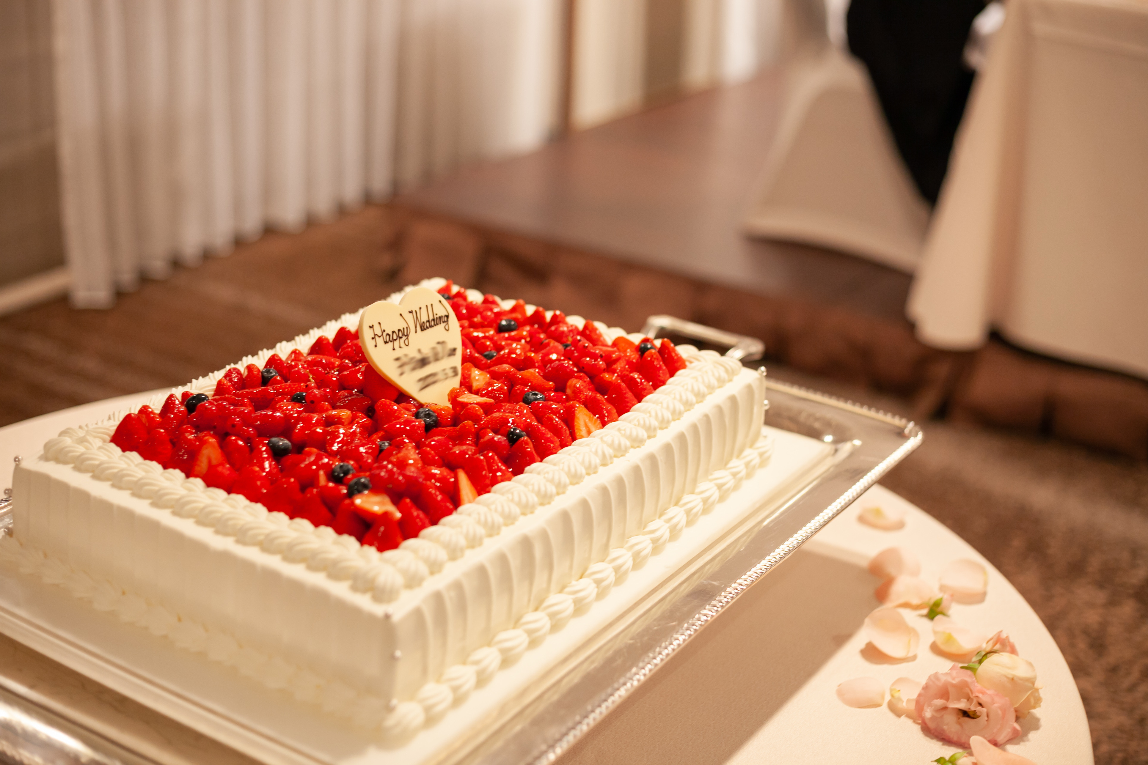 丁寧にクリームとフルーツを飾りつけ結婚式仕様に仕上げました