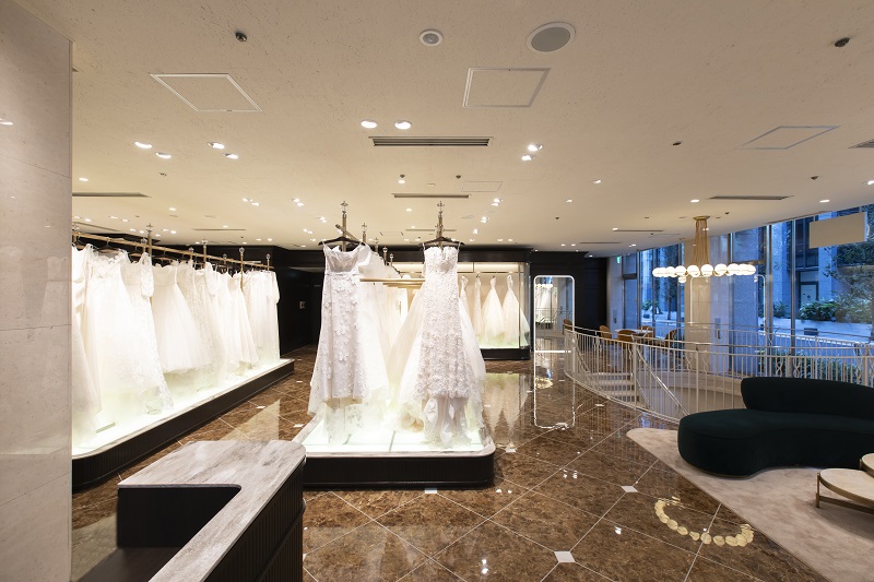 入り口を抜けるとまず目に入るのは、ガラス張りのショーウィンドウに並ぶウエディングドレス