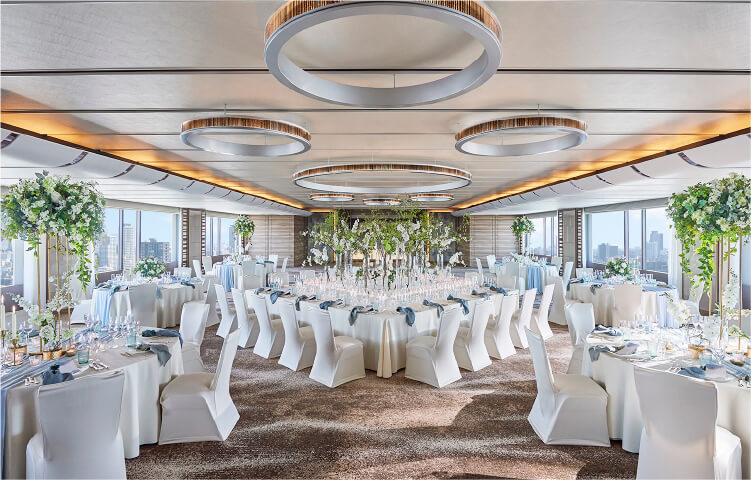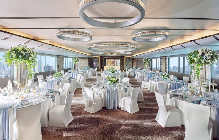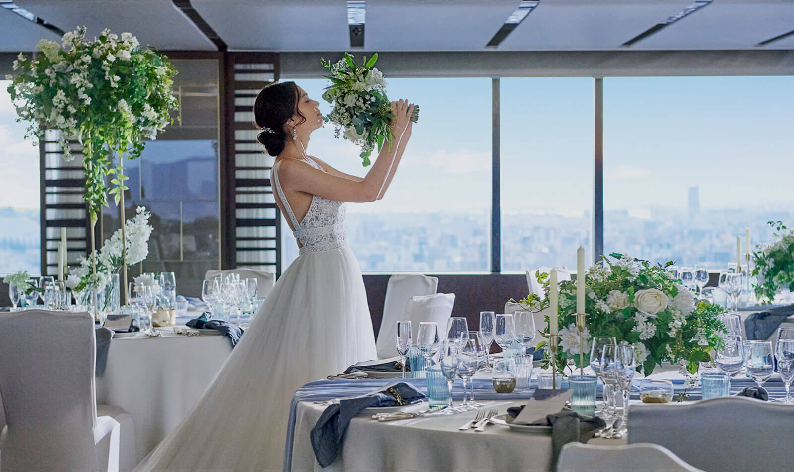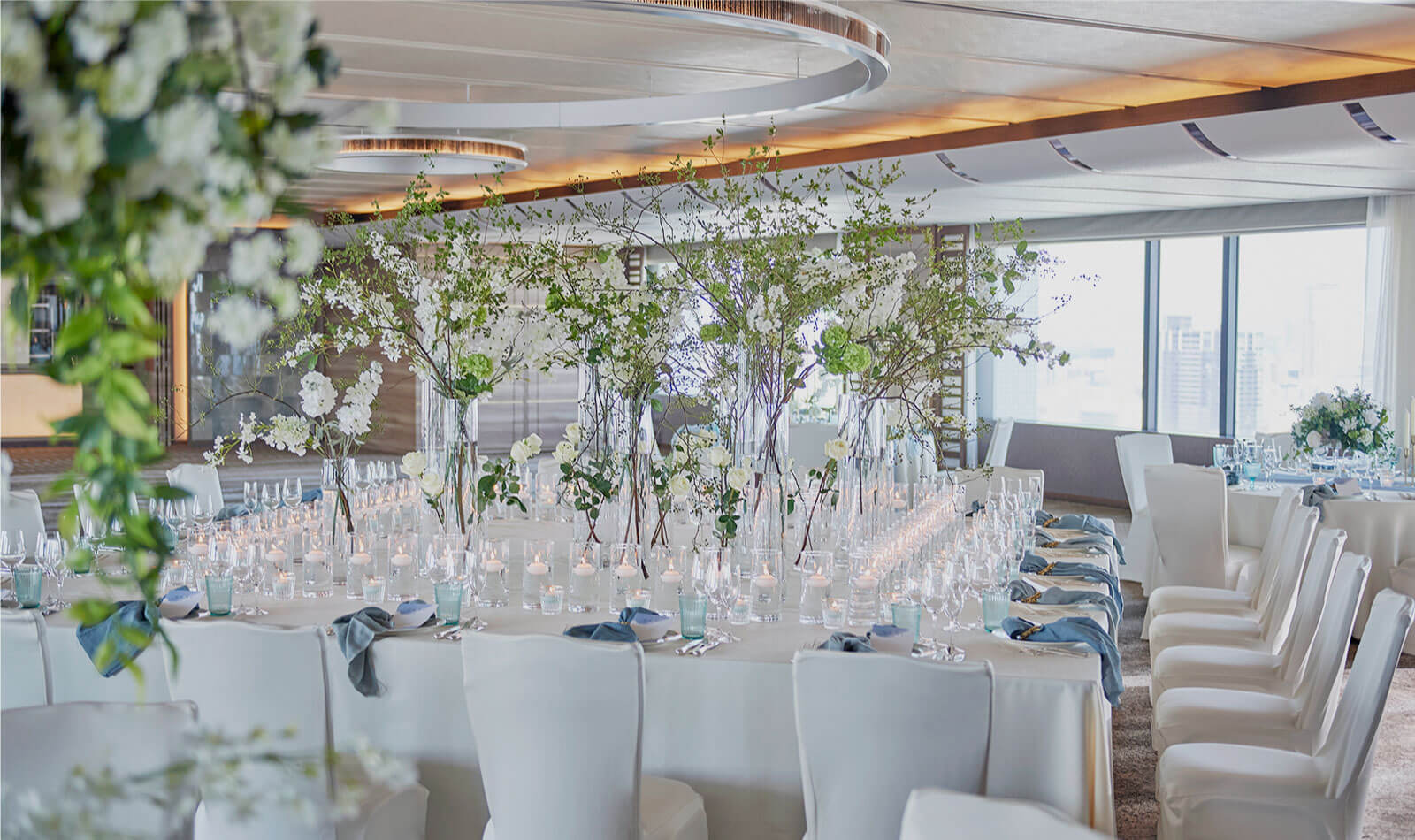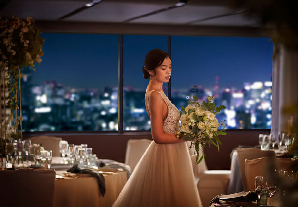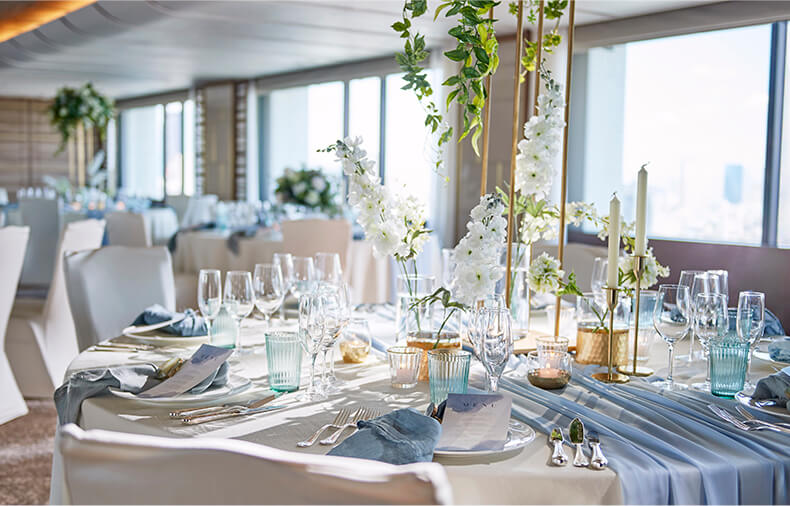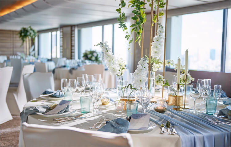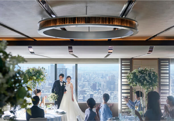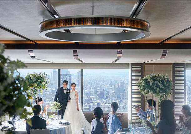 地上100mからパノラマに広がる景色が一望できる、特別な空間でのウエディング。大きな窓からは自然光と空の雄大さを実感できる開放的な雰囲気。光が差し込む明るい時間はもちろん、夕暮れや煌めく夜景など、時間帯問わず魅力のある会場です。
