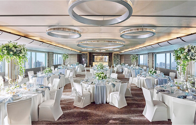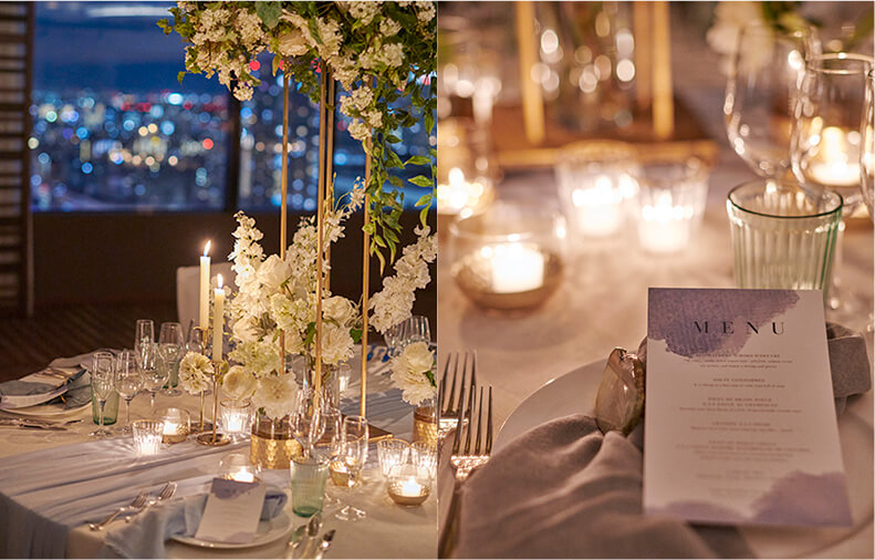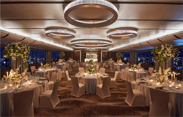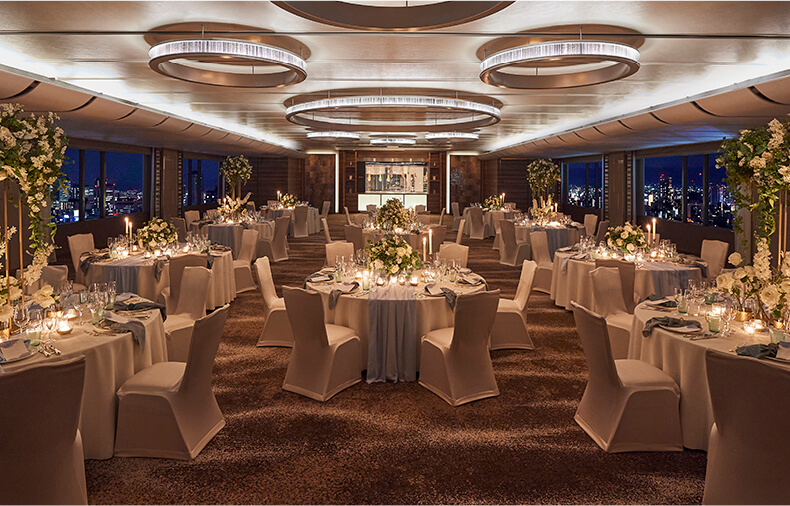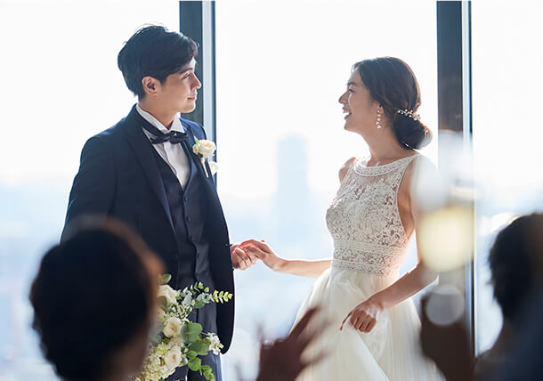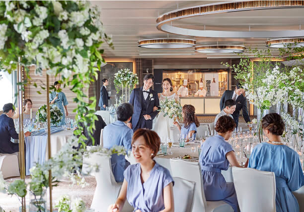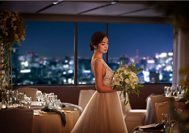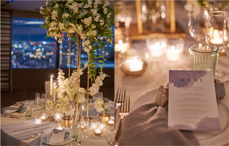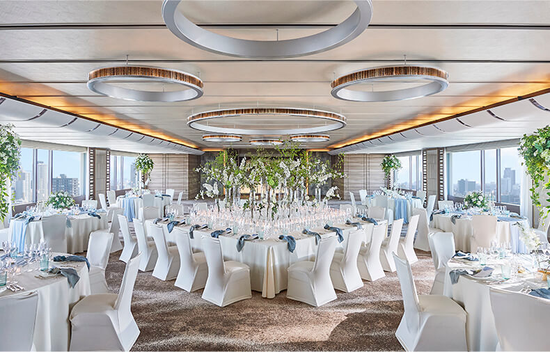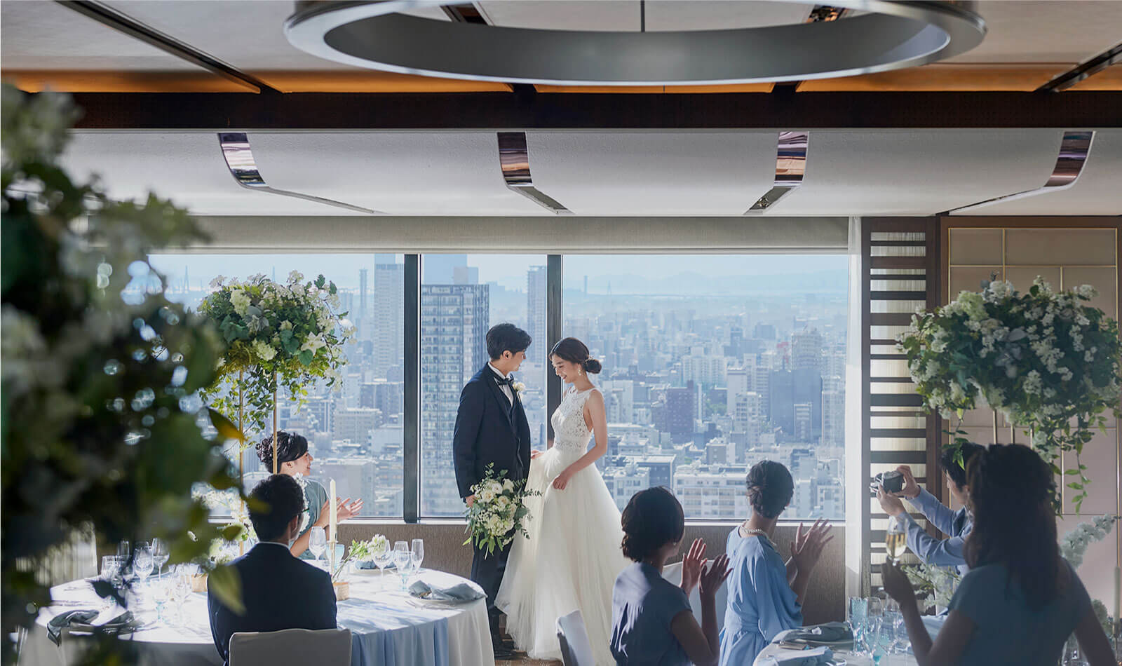 地上100mからパノラマに広がる景色が一望できる、特別な空間でのウエディング。大きな窓からは自然光と空の雄大さを実感できる開放的な雰囲気。光が差し込む明るい時間はもちろん、夕暮れや煌めく夜景など、時間帯問わず魅力のある会場です。