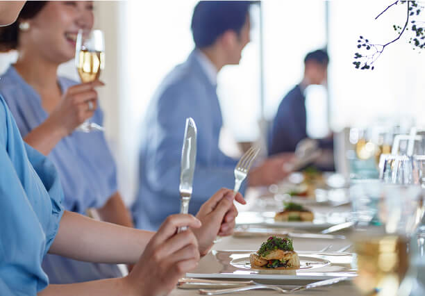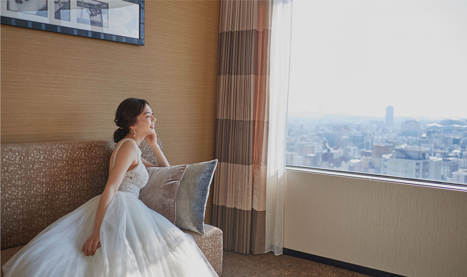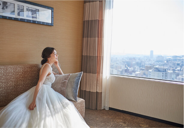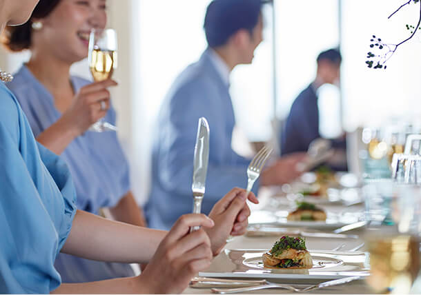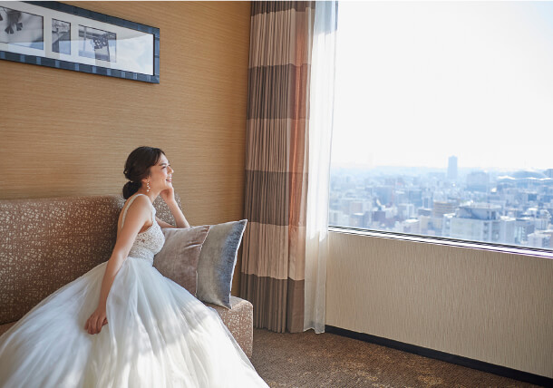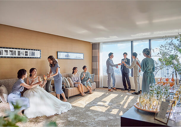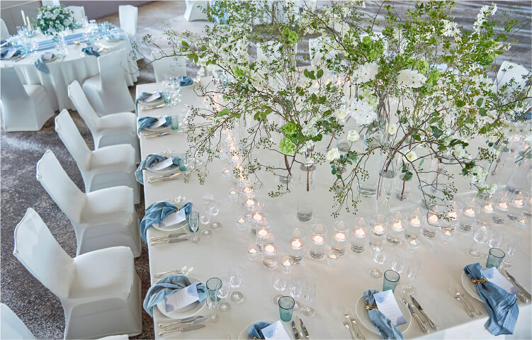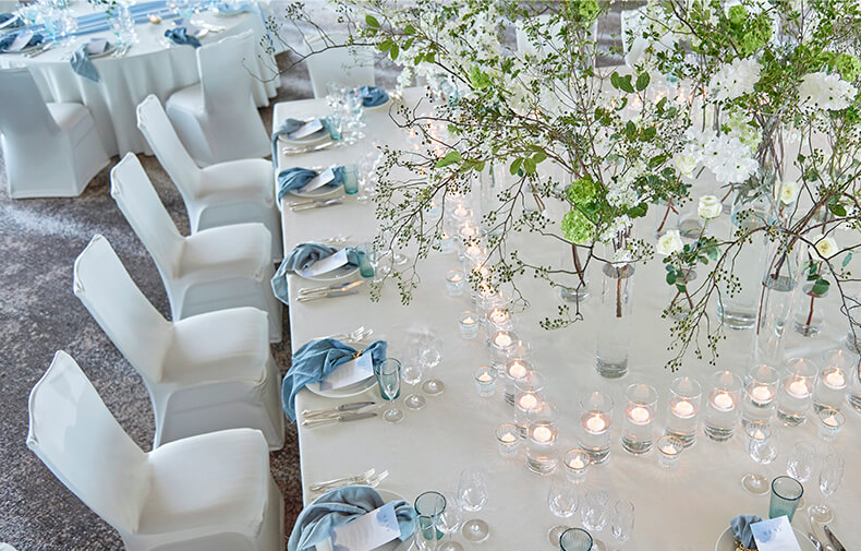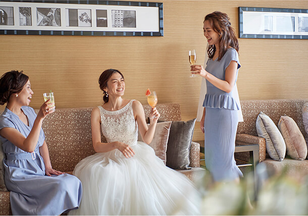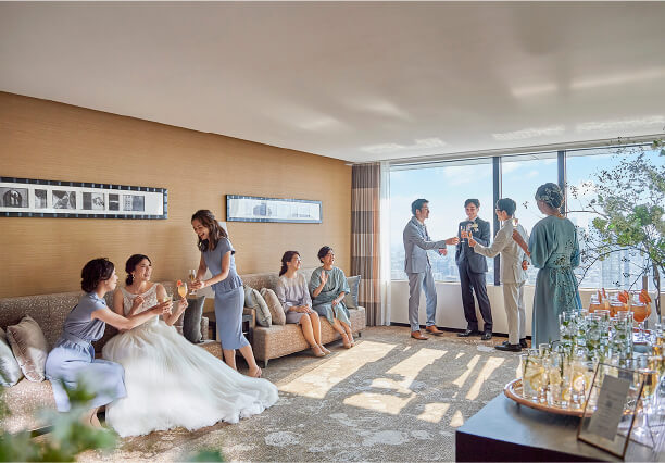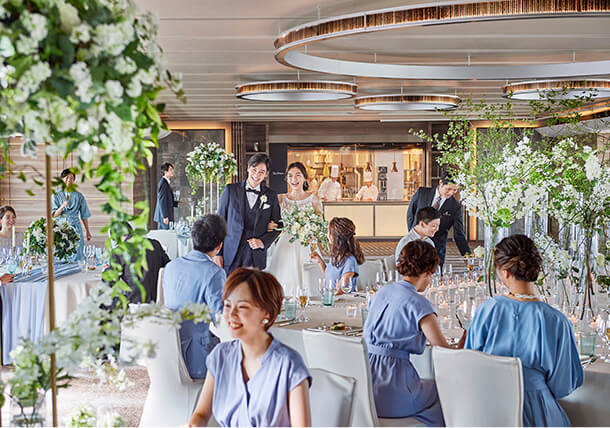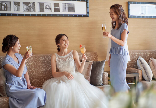 ホテルではめずらしい、ワンフロアすべてを貸し切ったプライベートウエディングが実現。会場内だけでなく、ホワイエでのドリンクパーティなど、ゆったり寛げる時間もお過ごしいただけるので、おもてなしの幅が広がります。