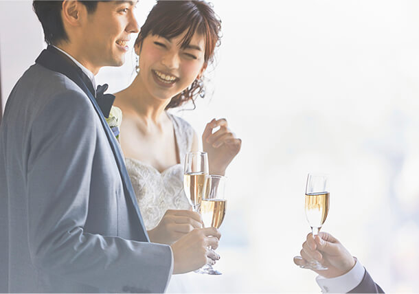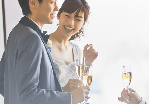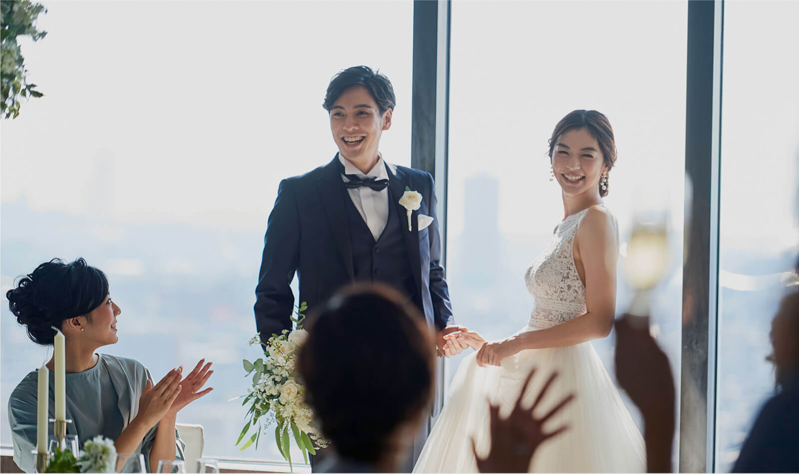 10年以上のお付き合いを経て結婚式を迎えられたおふたり。共通のお知り合いも多く、気心の知れたゲストとのウエディングパーティは終始和やかな時間となりました。眺望を背景にした贅沢な記念写真、グリーンを使ったナチュラルコーディネートの中で過ごす笑顔溢れる時間など、アットホームでありながら上質な一日をお過ごしになりました。
