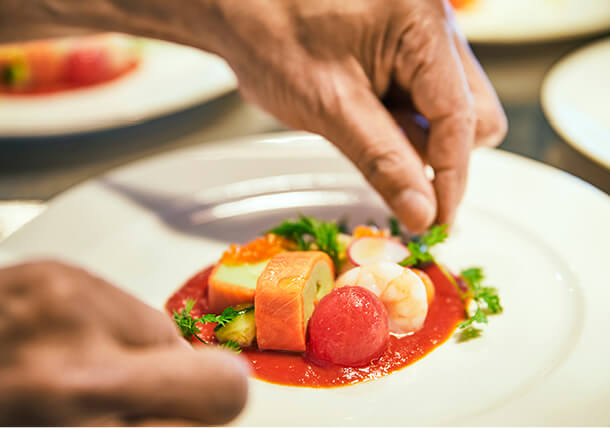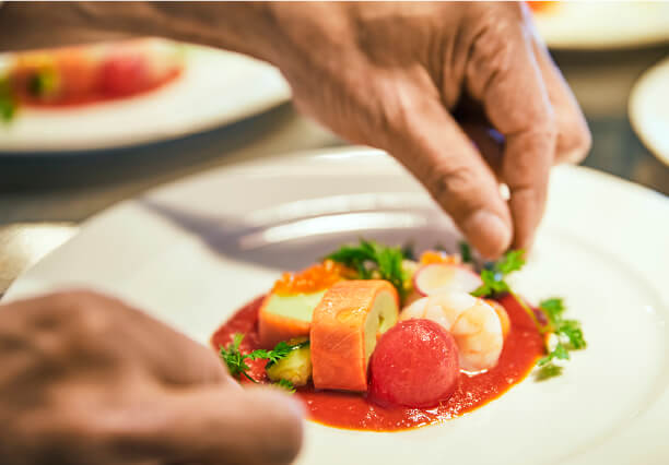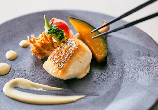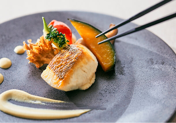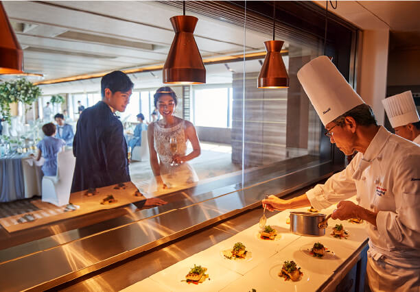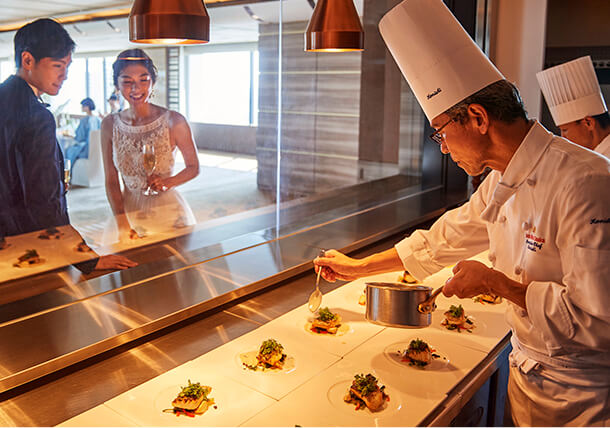 料理の期待感も高まるオープンキッチン。一皿一皿丁寧につくられる様子を間近に愉しむことができます。お客様の表情や食事の進み具合まで確認しながら仕上げる料理を、出来立てのベストな状態でお届けできるのもオープンキッチンならでは。