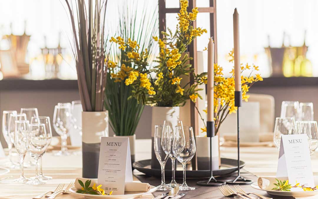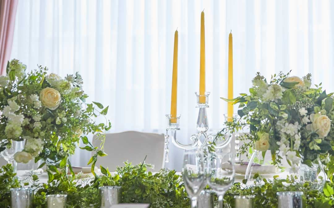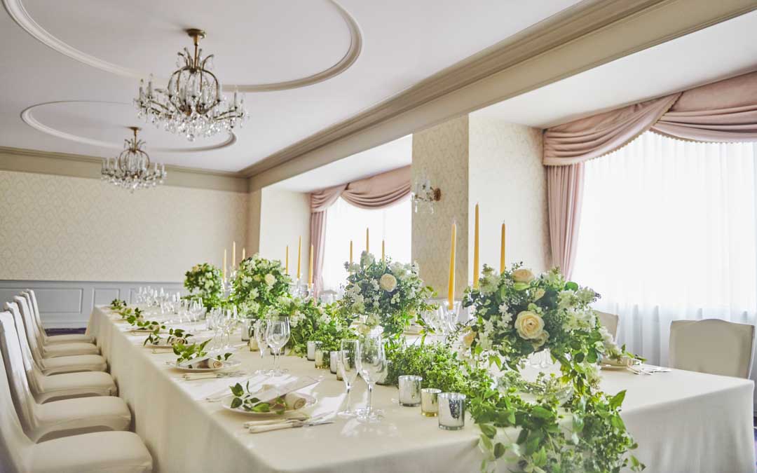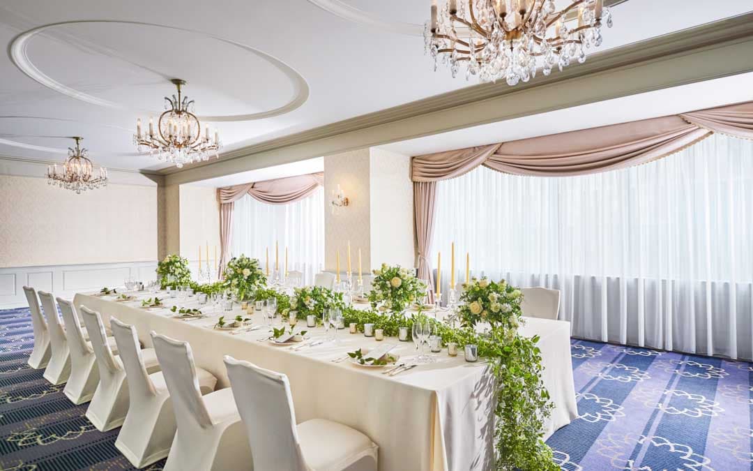 ゲストとの距離感が程よいサイズの会場。家族や友だちと過ごす時間を大切にしたいおふたりに。窓からは美しいイチョウ並木を望み、四季折々の御堂筋が楽しめます。