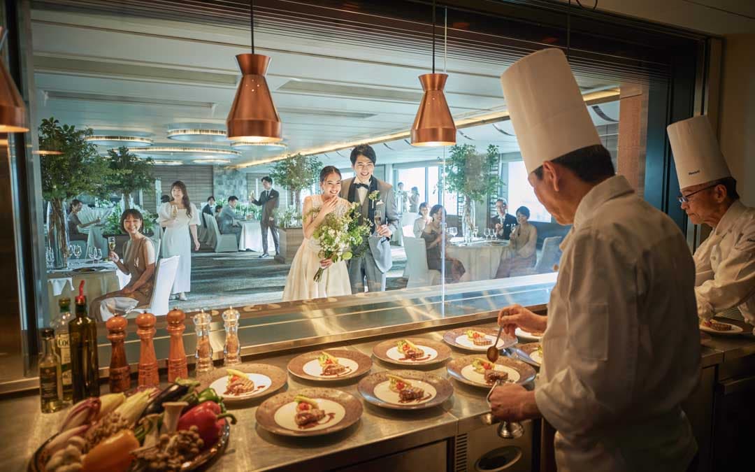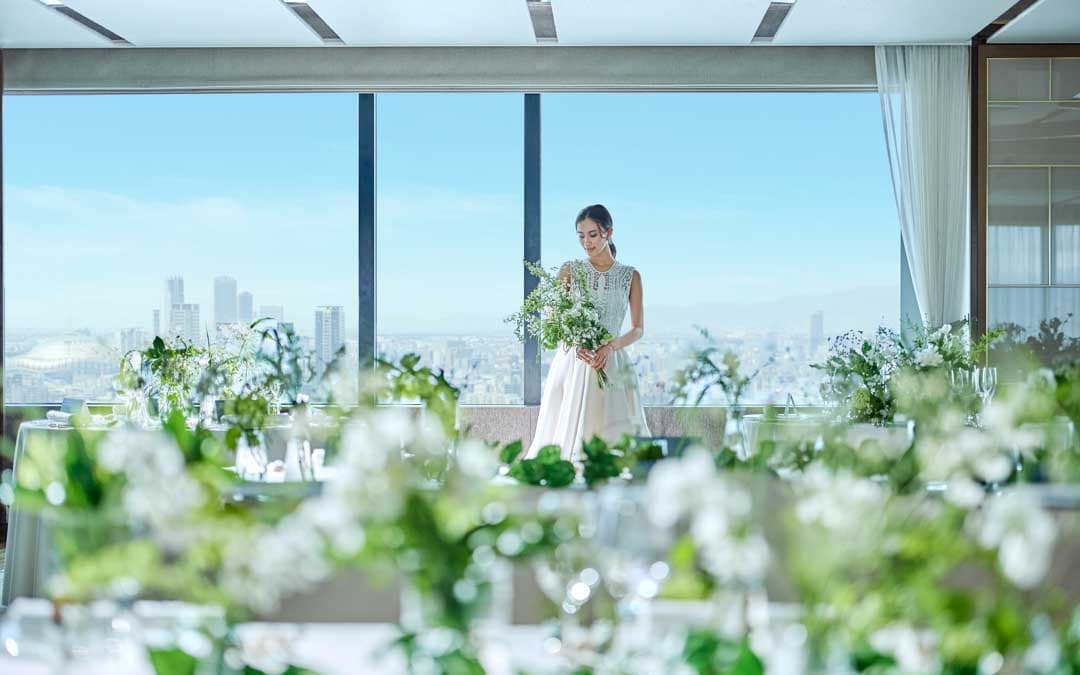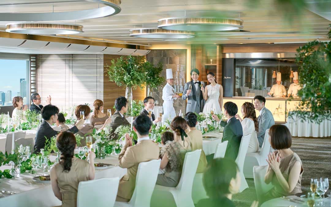 ホテル最上階をフロアごと貸し切り、贅沢なひとときを過ごせるパーティー会場。地上100mから遠く生駒山や神戸まで一望できる圧倒的なパノラマビューは、最高のおもてなしに。オープンキッチンも備わり、料理演出もお楽しみいただけます。