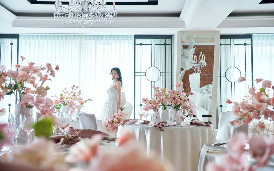 大きな窓越しに明るい自然光が注ぐパーティー会場。シャンデリアやミラーのきらめきが優美な気品を漂わせて、花嫁の可憐なドレス姿がいっそう美しく輝きます。